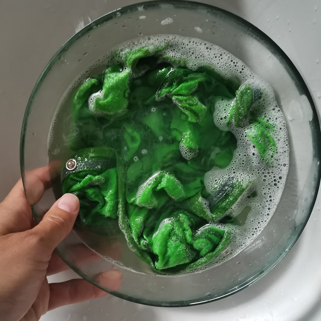 1) Merino oblečení, které se chystáte barvit, vyperte. Zajistíte si tím, že barva chytne všude stejně. Na merino oblečení doporučujeme využít náš kvalitní prací gel na vlnu OVEJA.